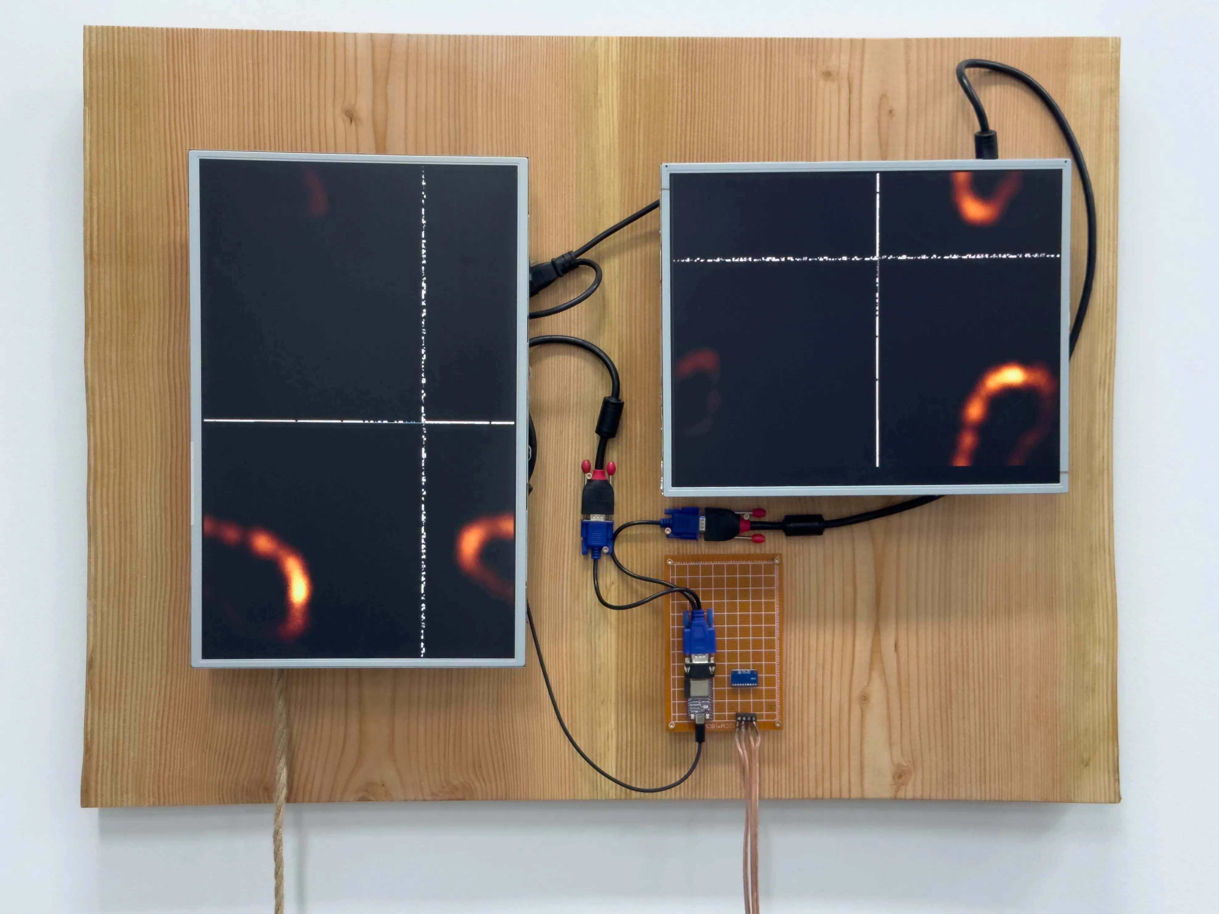 Through the Electromagnetic Memory Effect, that energy might carry something of the lost Khazar knowledge. Using custom made display elements and a generative algorithm, myth and measurements mix into a speculative refiguration of Khazar aesthetics, a sun spot, a fire.