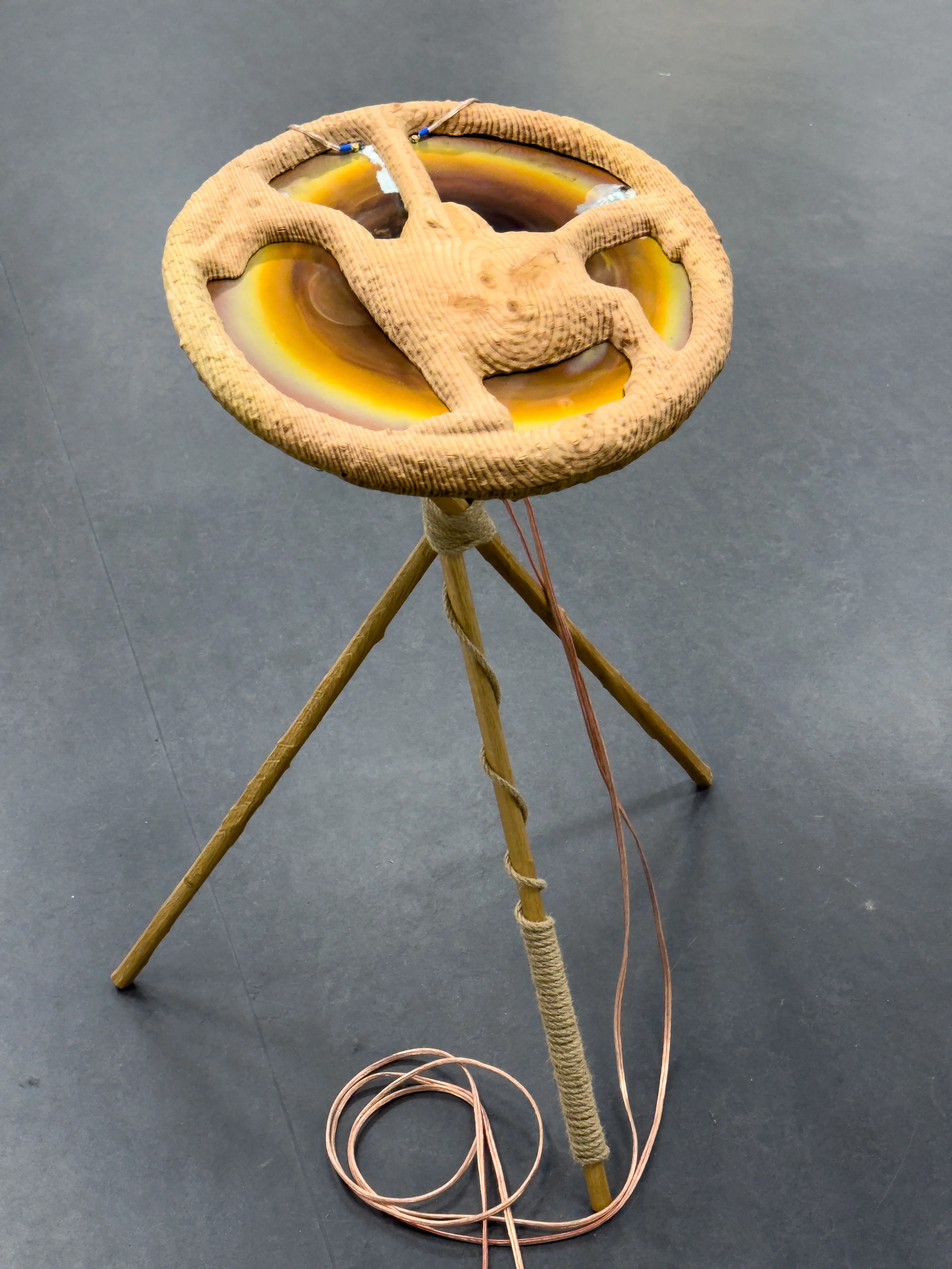 Lighting The Same Fire is a device for gleaning meaning from the same energy they worshipped and harnessed. An artist-made solar panel shaped as a Khazar sun pendant collects electromagnetic energy through the photovoltaic response of Copper Dioxide.