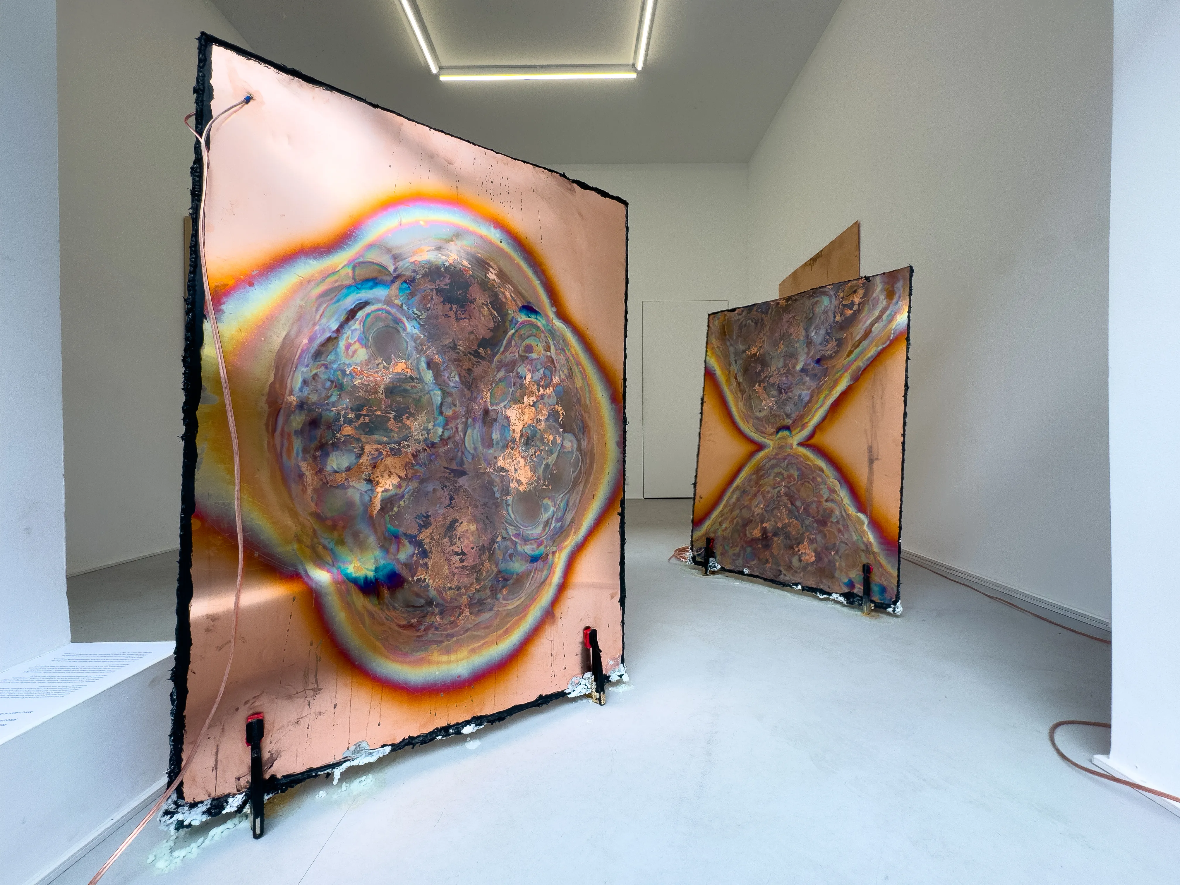Handmade copper solar panels face the window, harvesting sunlight. Their fluctuating energy feeds a custom circuit mounted on a copper plate, driving an e-ink display that renders the slow growth of a metal crystal. The pattern shifts throughout the day and over the run of the show, accumulating and decaying with the available light.