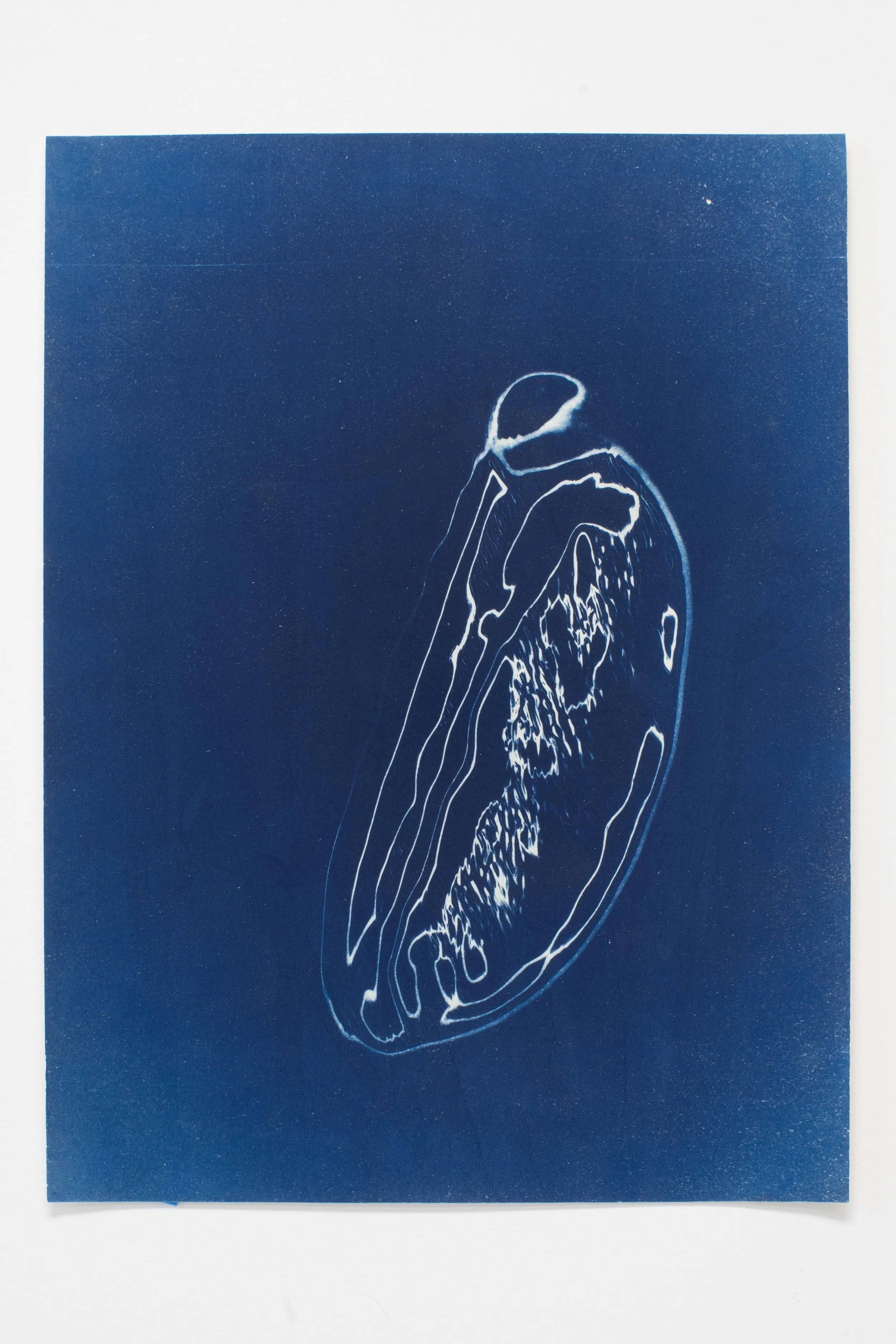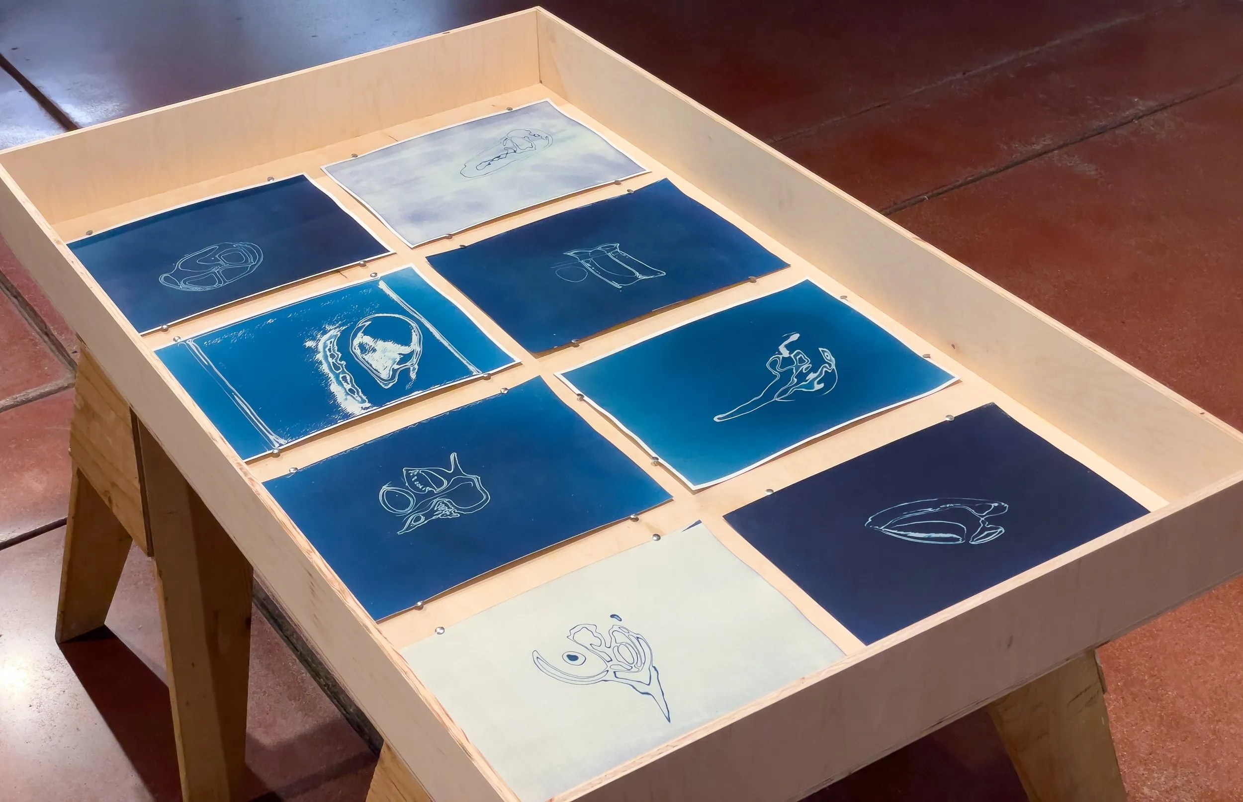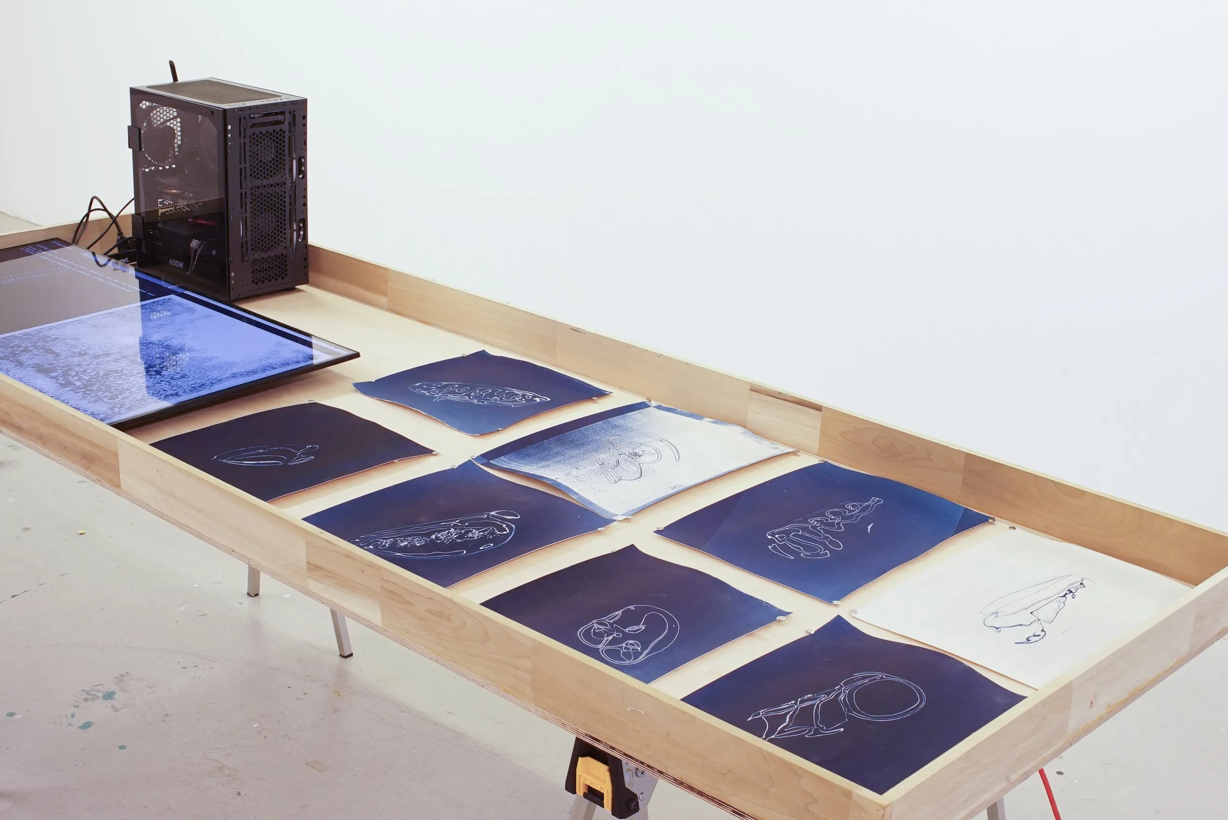 PC, AI algorithm, speculative archeology object database, cyanotype on paper, 2023