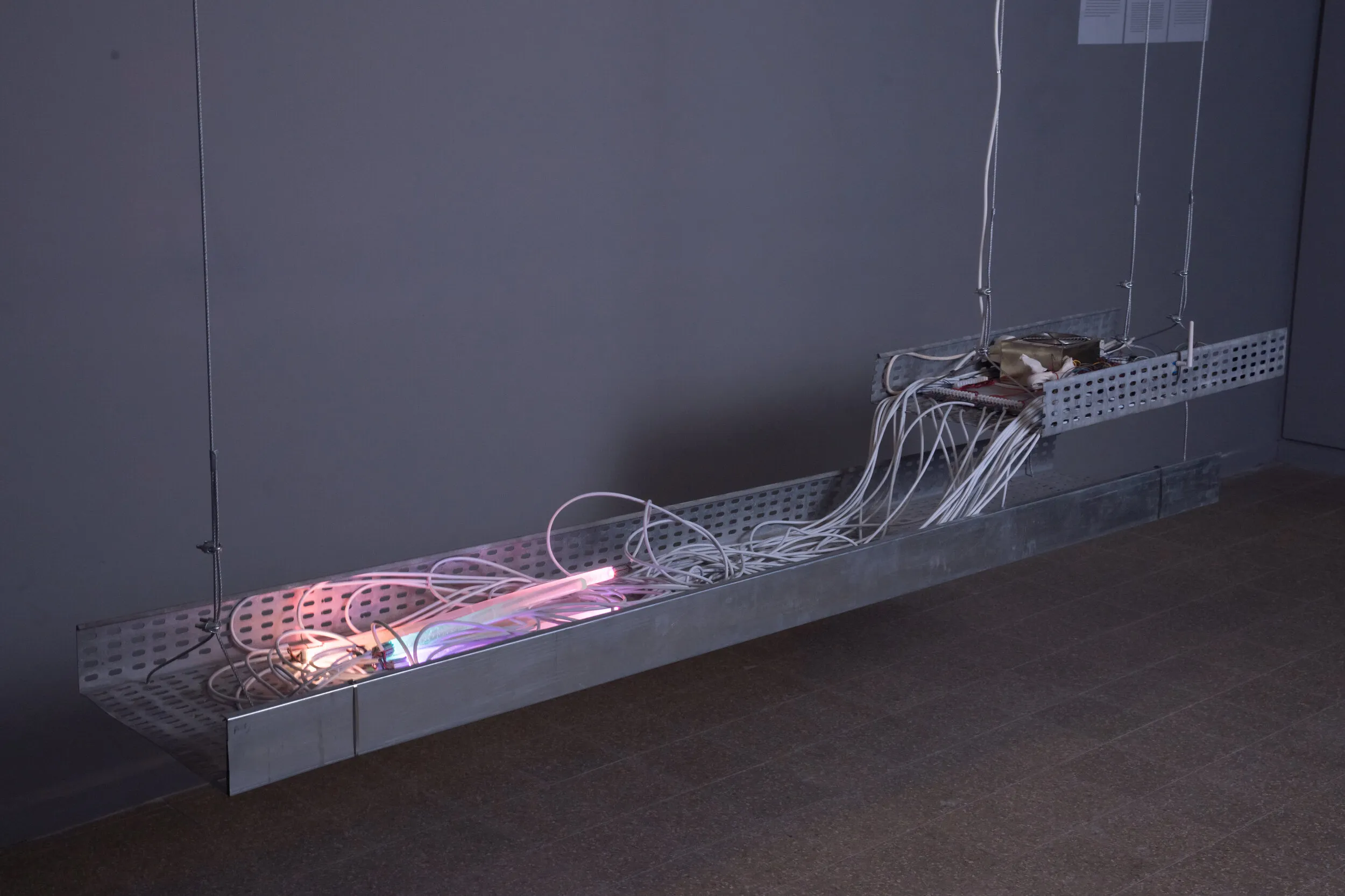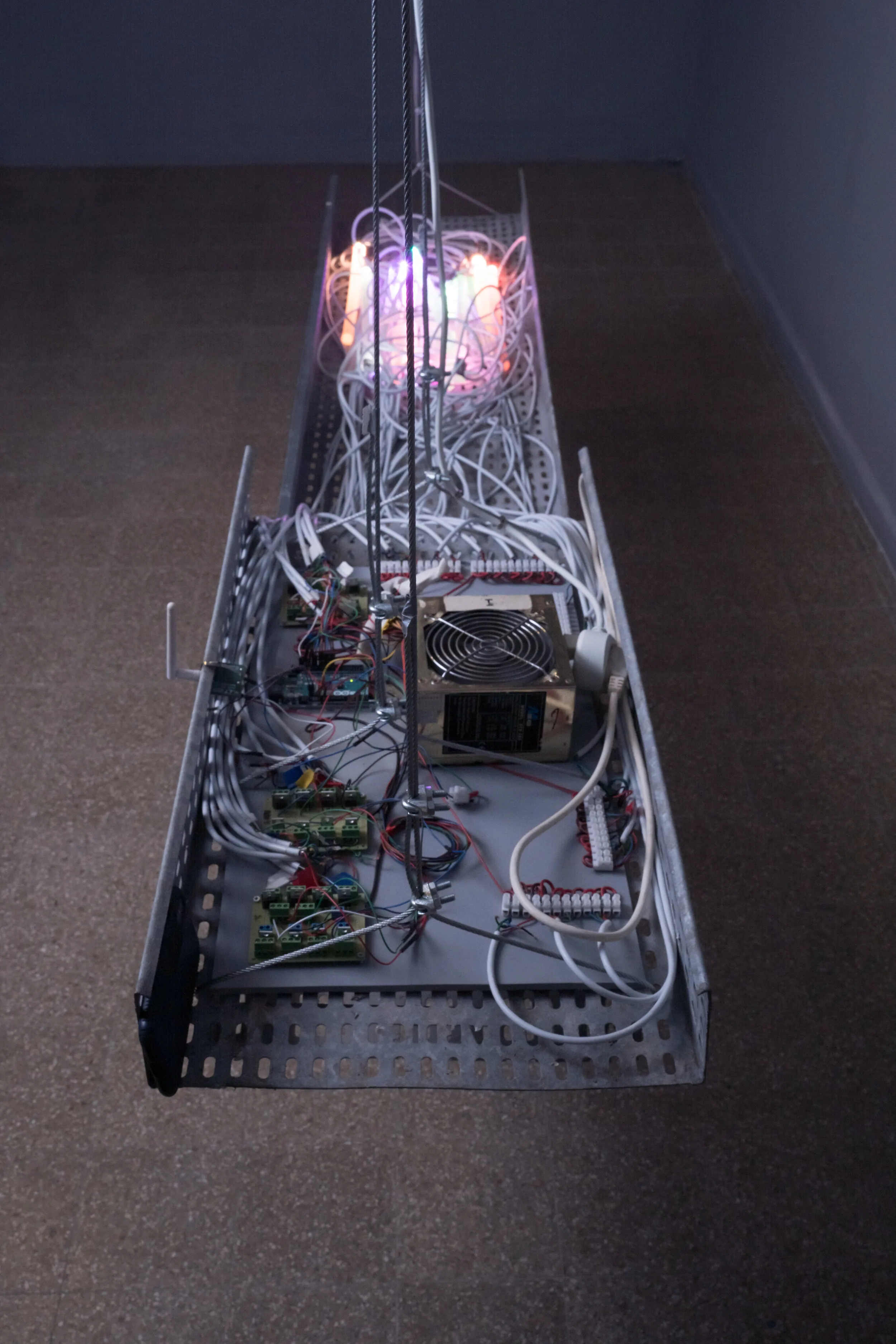 Steel rail, epoxy casts with LED inserts, custom electronic mechanism reacting to internet activity in its proximity
