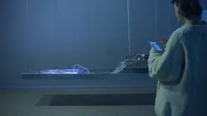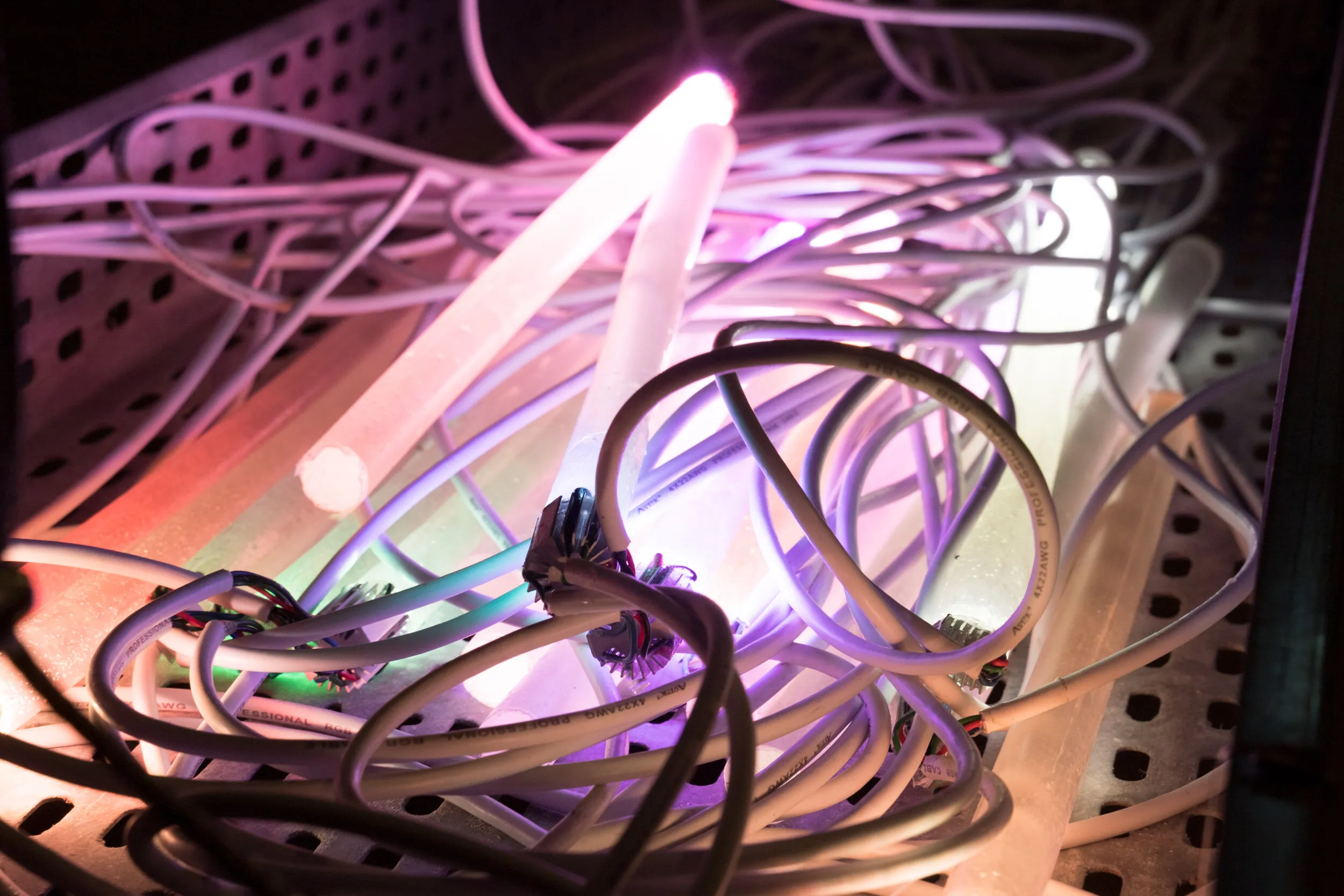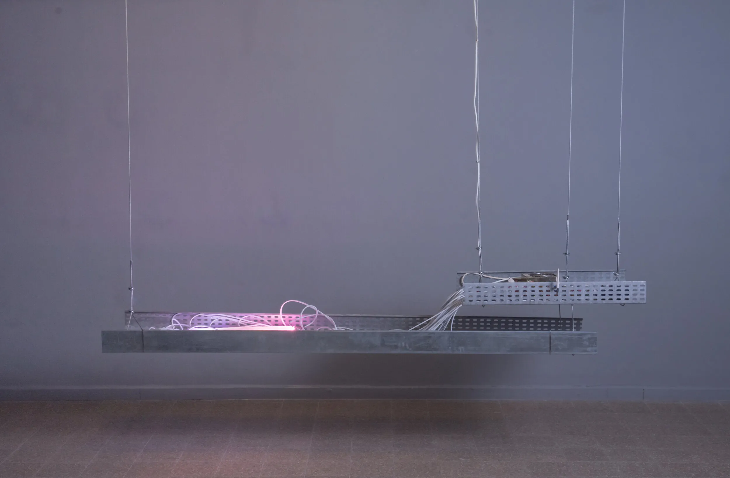 Tracing back the history of optical fibers to an experiment that formed some of its basic principles, the fact that the original intention was to create visibility into a phenomenon is intruiging in its relation to the visual. The physicist who found the effect called Total Reflection, Jean-Daniel Colladon, originally created it in order to make visible the physical shape of a water jet flow demonstrated at his lecture table. The work is an attempt at bringing visibility into the physicality of current technologies used for delivering media rich content into the palms of our hands. It is not a warning sign nor a smiling emoji, but a mere reflection. It is a peculiar fact that this media saturated present is enabled by an optical phenomenon which is not only hidden from plain sight, but buried deep underground, in cables laid at the bottom of the ocean, underneath roads and urban landscapes. On top of it sits yet another broad abstraction related to the electromagnetic radio signals enabling wireless communication. Our wireless lives are thus also our lives with that which cannot be seen.